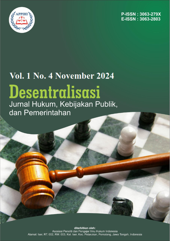 Vol. 1 No. 4 (2024)Desentralisasi : Jurnal Hukum, Kebijakan Publik, dan Pemerintahan, Jurnal ini ditujukan untuk publikasi artikel ilmiah yang diterbitkan oleh Asosiasi Peneliti dan Pengajar Ilmu Hukum Indonesia, akan mencakup berbagai aspek terkait dengan tema desentralisasi dalam konteks hukum, kebijakan publik, dan pemerintahan. Jurnal ini membahas bagaimana sistem desentralisasi mempengaruhi berbagai aspek kehidupan sosial dan politik di suatu negara. Artikel-artikel dalam jurnal ini mungkin membahas tentang implementasi desentralisasi dalam konteks hukum, misalnya dalam hal otonomi daerah, pengaturan kebijakan di tingkat lokal, dan dampaknya terhadap administrasi pemerintahan.