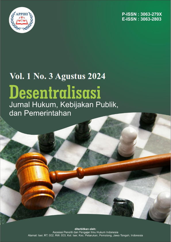 Vol. 1 No. 3 (2024)Desentralisasi : Jurnal Hukum, Kebijakan Publik, dan Pemerintahan, Jurnal ini ditujukan untuk publikasi artikel ilmiah yang diterbitkan oleh Asosiasi Peneliti dan Pengajar Ilmu Hukum Indonesia, akan mencakup berbagai aspek terkait dengan tema desentralisasi dalam konteks hukum, kebijakan publik, dan pemerintahan. Jurnal ini membahas bagaimana sistem desentralisasi mempengaruhi berbagai aspek kehidupan sosial dan politik di suatu negara. Artikel-artikel dalam jurnal ini mungkin membahas tentang implementasi desentralisasi dalam konteks hukum, misalnya dalam hal otonomi daerah, pengaturan kebijakan di tingkat lokal, dan dampaknya terhadap administrasi pemerintahan.